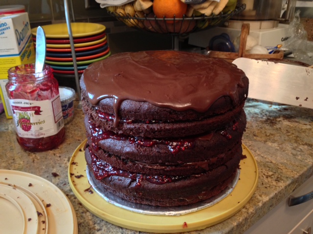 Also, I’m super proud of the gluten-free chocolate raspberry cake Jill and I made. I ate it at the shower on Saturday…then at 3am when Ari and I were up…and then again for breakfast. As documented by the picture, I did not make my own raspberry preserves for the cake. F— that. $2.95 Trader Joe’s preserves work just fine.