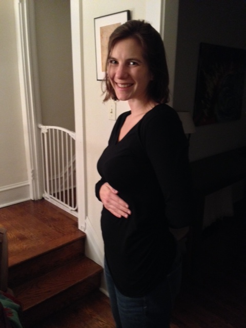 I’m now at 15 weeks gestation and officially into the sweet spot of pregnancy.  My body seems to have fallen into its former pregnancy frame much more quickly.  I woke up one morning last week wondering if I suddenly had a bump or merely the all too standard food baby; a friend later confirmed: “Definitely have a gut.”  Tried to get John to snap a few pictures during our brief moments of overlap this evening…(not the best lighting, but I thought the scattered toddler toys add a certain whimsical, and entirely realistic, quality.)